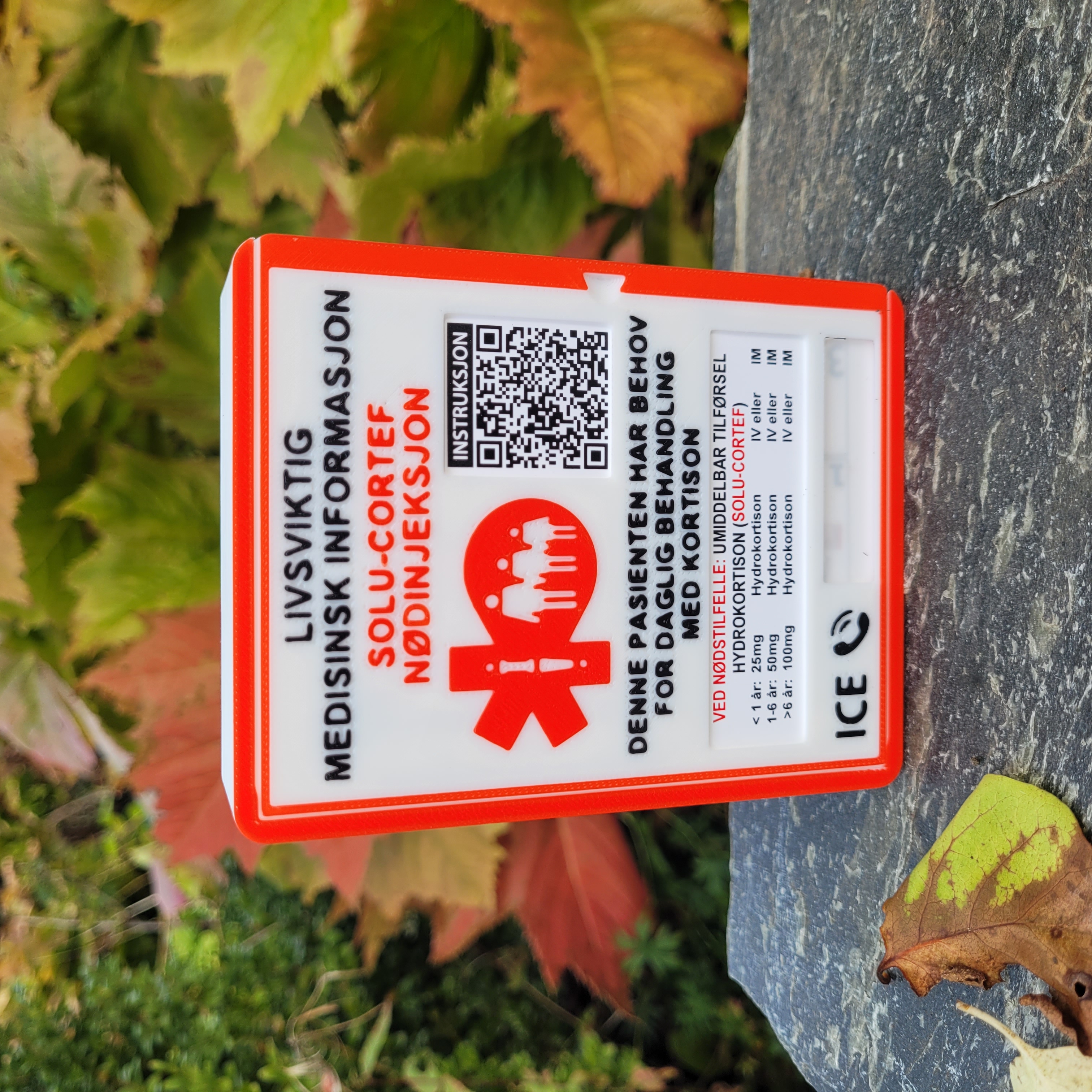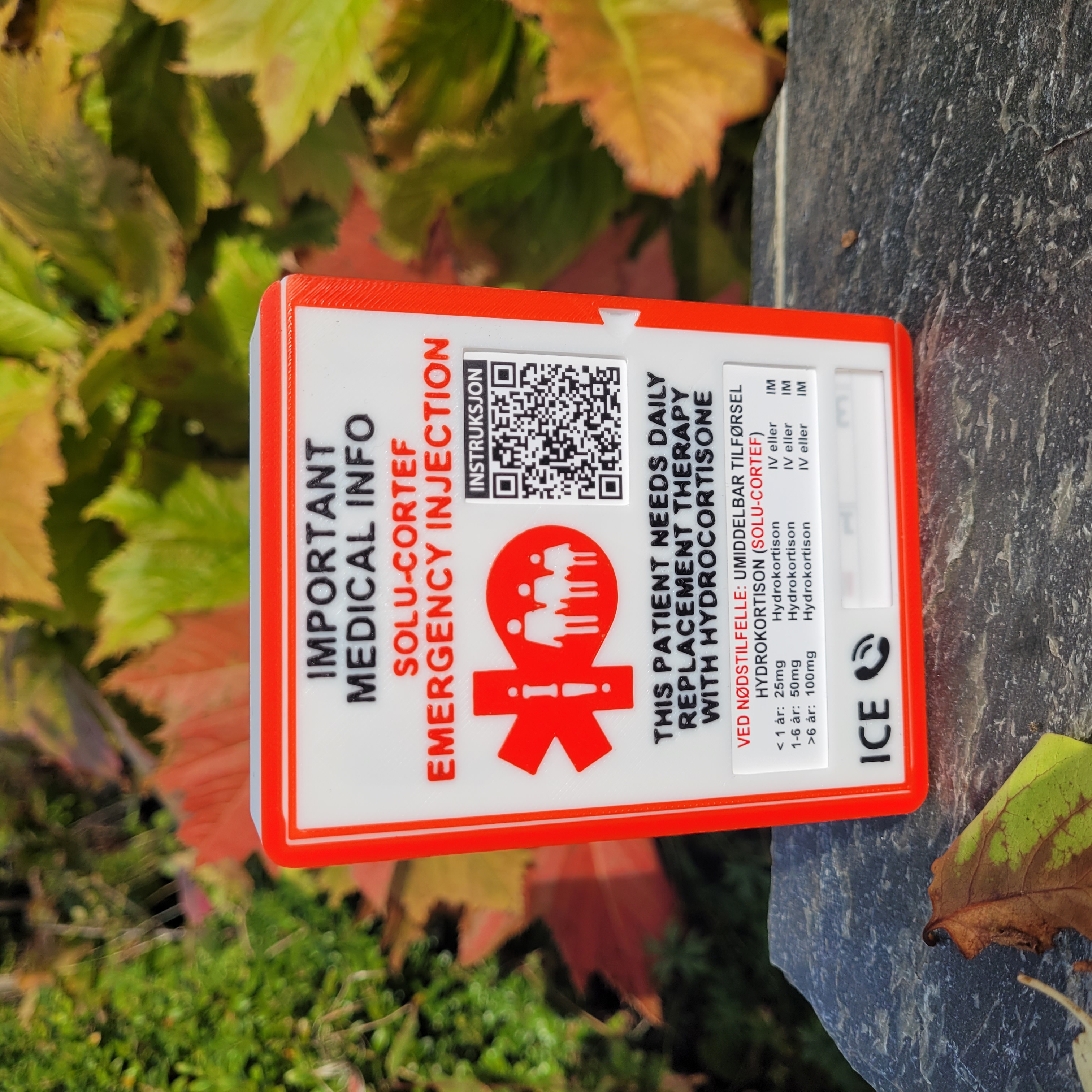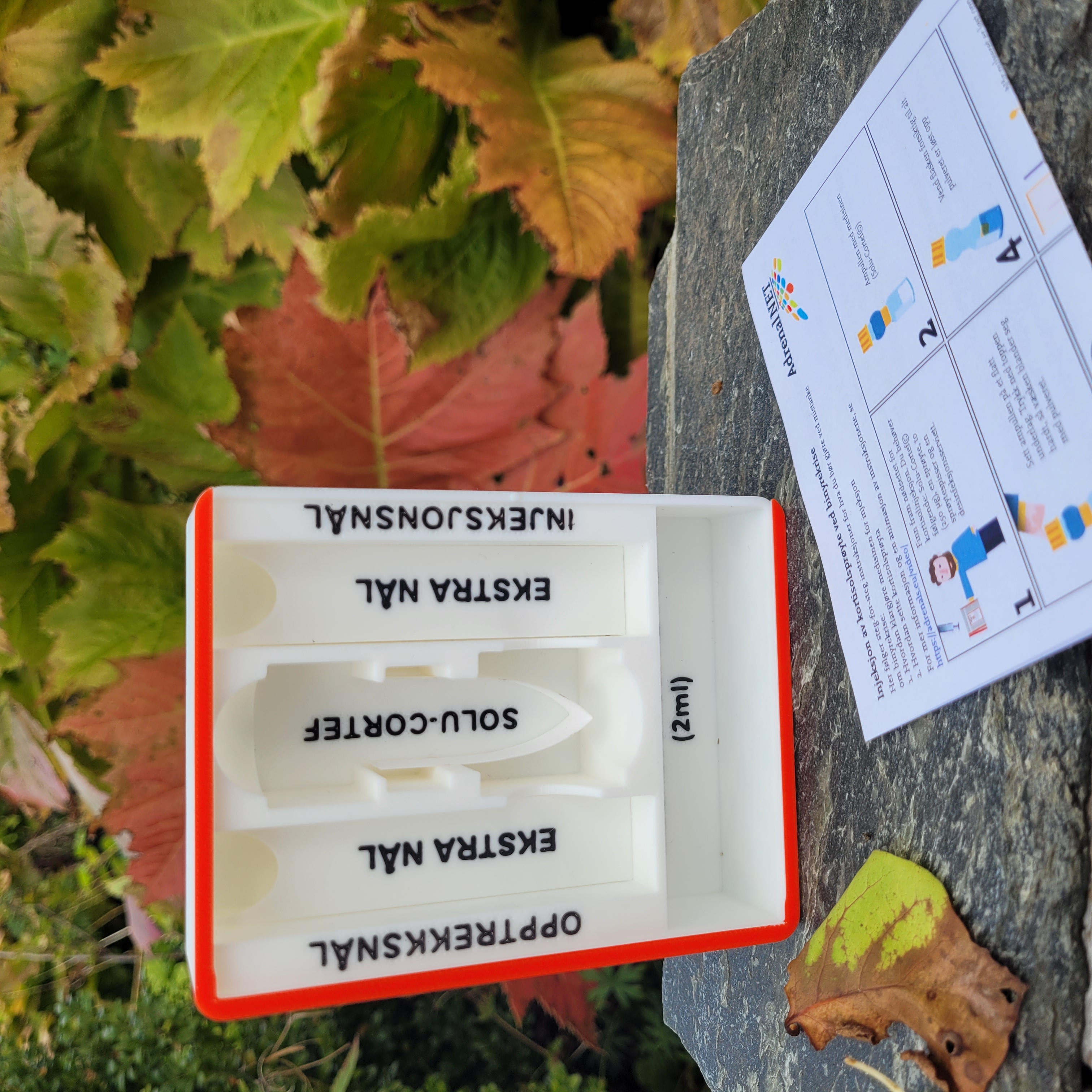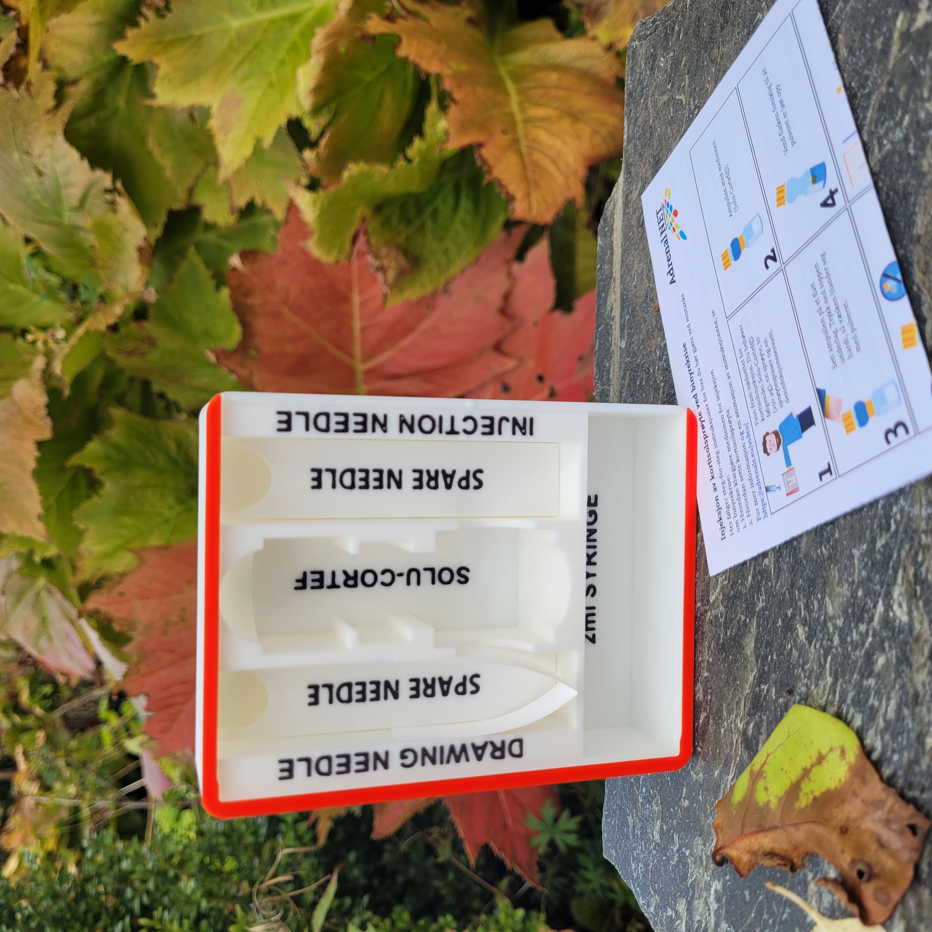 En egendesignet boks til nød-injeksjonssett. Den finnes til barn og voksne, velg riktig når du bestiller.